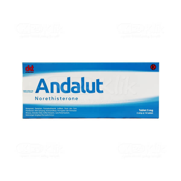 Deskripsi:ANDALUT 5MG memiliki kandungan bahan aktif Norethisterone yang digunakan untuk amenorea & perdarahan uterus abnormal karena ketidakseimbangan hormon tanpa gangguan organik, endometriosis. Andalut dapat dikonsumsi bersama atau tanpa makanan. Konsultasikan terlebih dahulu kepada dokter apabila akan digunakan pada pasien dengan riwayat atau kondisi sakit seperti:
