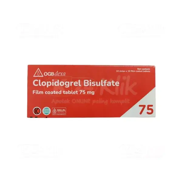 Deskripsi:CLOPIDOGREL DEXA 75MG merupakan obat antiplatelet yang bekerja dengan mencegah platelet atau trombosit saling menempel sehingga tidak membentuk gumpalan darah yang beresiko terbentuk penyumbatan pada arteri dan terjadi trombosis arteri seperti serangan jantung dan stroke. Obat ini digunakan untuk mengencerkan darah dan mencegah terjadinya pembekuan darah sehingga mengurangi resiko terkena serangan jantung dan stroke. Clopidogrel dapat dikonsumsi sebelum atau sesudah makan, dapat dikonsumsi kapan pun, namun usahakan mengonsumsinya di waktu yang sama tiap harinya atau sesuai dengan petunjuk dokter. Konsultasikan kepada dokter terlebih dahulu apabila akan digunakan pada pasien dengan kondisi: