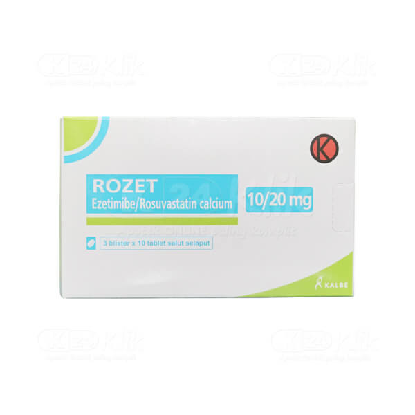 Deskripsi:ROZET 10/20MG memiliki kandungan bahan aktif Ezetimibe dan Rosuvastatin. Ezetimibe merupakan obat yang digunakan untuk menurunkan kadar kolesterol tinggi, sedangkan Rosuvastatin termasuk obat golongan inhibitor reductase HMG CoA atau statin yang bekerja dengan cara mengurangi pembentukan kolesterol oleh hati sehingga kadar kolesterol di dalam darah terkendali. Rosuvastatin digunakan untuk mengontrol kolesterol dan trigliserida sehingga dapat mengurangi risiko penyakit kardiovaskular (jantung dan pembuluh darah).