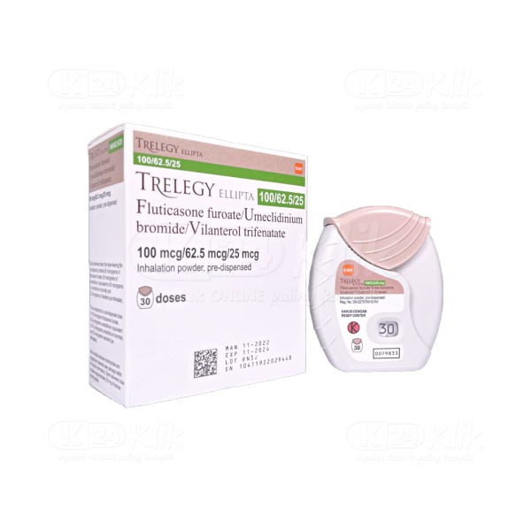 Indikasi / Manfaat / Kegunaan:TRELEGY ELLIPTA ditujukan sebagai terapi pemeliharaan untuk pasien dewasa dengan Penyakit Paru Obstruktif Kronik (PPOK) derajat sedang hingga berat, yang tidak teratasi secara adekuat dengan kombinasi kortikosteroid inhalasi dan agonis ?2 kerja-panjang atau kombinasi dari agonis ?2 kerja-panjang dan antagonis muskarinik kerja-panjang. |
