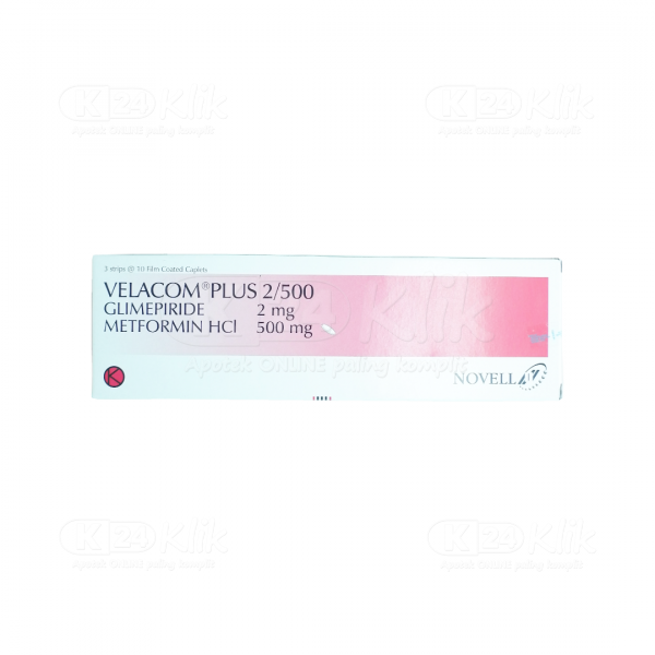 Deskripsi:VELACOM PLUS 2/500 FC CAPTAB 30S mengandung Glimepiride 2 mg dan Metformin 500 mg. Obat ini digunakan untuk mengendalikan kadar gula darah tinggi pada penderita diabetes tipe 2. Glimepiride mendorong pankreas untuk memproduksi insulin dalam tubuh dan membantu tubuh menggunakan insulin secara lebih efisien. Metformin bekerja dengan mengurangi produksi glukosa hepar, mengurangi penyeapan glukosa intestinal, dan meningkatkan sensitivitas insulin. Obat ini sebaiknya digunakan untuk meningkatkan efek diet dan aktivitas fisik yang cukup, bukan menggantikannya. |