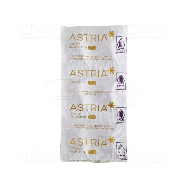 Deskripsi:ASTRIA 4MG merupakan suplemen yang digunakan untuk terapi suportif agar daya tahan tubuh meningkat dan memulihkan kondisi setelah sakit. Astria mengandung zat aktif Astaxanthin yang memiliki efek antioksidan kuat. Sebagai antioksidan, Astaxanthin dibutuhkan untuk menetralkan radikal bebas dan mencegah reaksi kimia berantai akibat pembentukan radikal bebas.