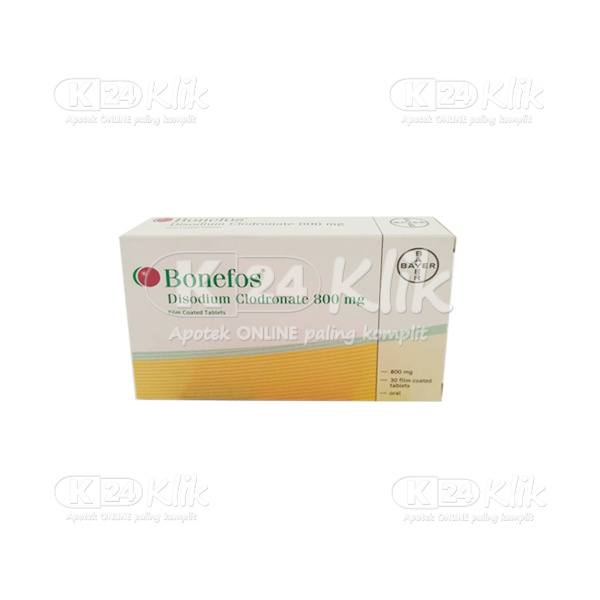 Deskripsi:Bonefos tablet digunakan untuk mengobati lesi osteolitik, hiperkalsemia dan nyeri tulang yang berhubungan dengan metastasis tulang pada pasien dengan kanker. Bonefos mengandung Clodronate disodium, obat yang termasuk obat golongan bifosfonat generasi pertama yang diproduksi oleh Bayer |