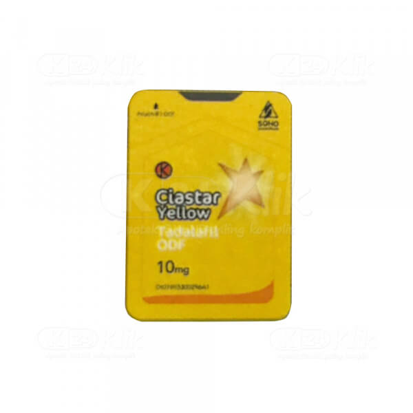 Deskripsi:CIASTAR YELLOW 10MG ODF 4S memiliki kandungan bahan aktif Tadalafil. Tadalafil merupakan obat yang digunakan untuk menangani impotensi atau disfungsi ereksi. Ciastar Yellow dapat dikonsumsi sebelum atau sesudah makan. Konsultasikan terlebih dahulu kepada dokter apabila akan digunakan pada pasien dengan riwayat atau kondisi sakit seperti: • Riwayat alergi terhadap kandungan obat ini. *Harga jual produk adalah per 1 pcs = 1 Tablet
