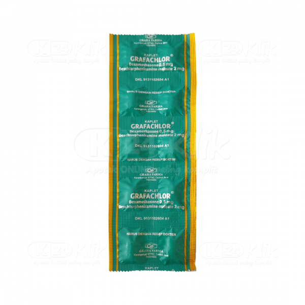 Deskripsi:Grafachlor diproduksi oleh PT. Graha Farma dan telah terdaftar di BPOM. Setiap tablet Grafachlor mengandung dexamethasone dan dexchlorpheniramine maleat. Kandungan dexamethasone pada Grafachlor merupakan glukokortikoid yang dapat mengatasi alergi dan inflamasi sedangkan kandungan dexchlorpheniramine maleat merupakan antihistamin yang bertugas membendung histamin sehingga kombinasi dari keduanya dapat digunakan untuk pengobatan sistomatik pada kasus alergi dan inflamasi yang membutuhkan terapi kortikosteroid. |