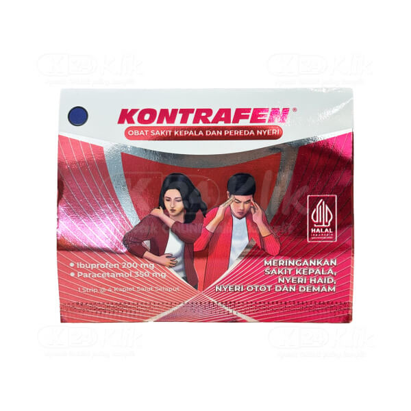 Deskripsi:KONTRAFEN merupakan obat yang digunakan untuk meringankan sakit kepala, nyeri haid (dismenore primer), nyeri otot dan menurunkan demam. Produk ini memiliki kandungan bahan aktif Paracetamol dan Ibuprofen.