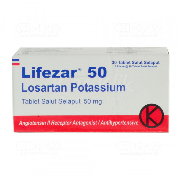 Deskripsi:Lifezar merupakan obat antihipertensi yang diproduksi oleh PT Darya Varia dalam bentuk tablet salut selaput dan telah terdaftar di BPOM. Tujuan dibuat dalam bentuk tablet salut selaput adalah untuk menutupi bau yang tidak sedap dari bahan yang terkandung di dalamnya. Tiap tablet Lifezar mengandung Losartan K yang termasuk dalam golongan angiotensin receptor blocker (ARB). Losartan yang terkandung dalam tablet Lifezar digunakan untuk terapi hipertensi dan juga untuk menurunkan risiko stroke pada sebagian orang dengan penyakit jantung. |