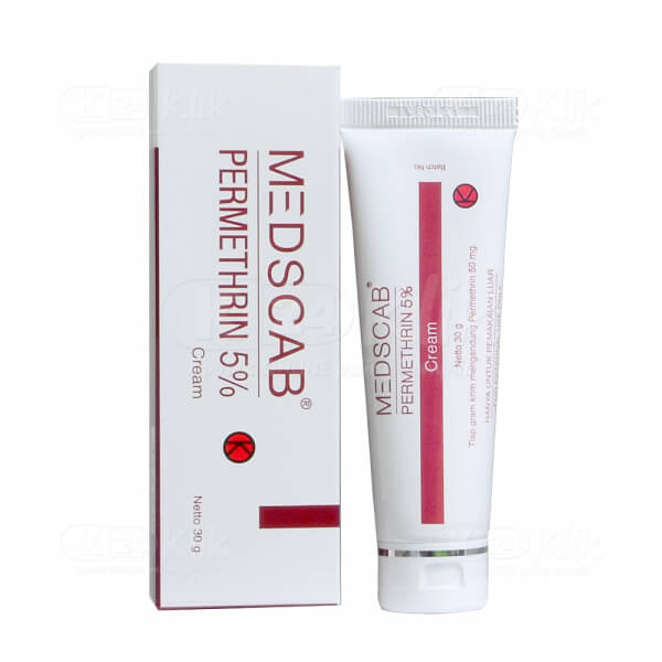 Deskripsi:Medscab 5% merupakan obat salep yang digunakan untuk mengobati infeksi kulit akibat parasit Sarcoptes scabiei yang dikenal sebagai kudisan. Kudis disebabkan oleh tungau yang menempel pada kulit dan kutu yang hidup di kulit kepala. Medscab mengandung zat aktif Permethrin yaitu antiparasit spektrum luas terhadap tungau, kutu rambut, kutu badan serta anthropoda lainnya. Mekanisme kerja dari Permethrin adalah :