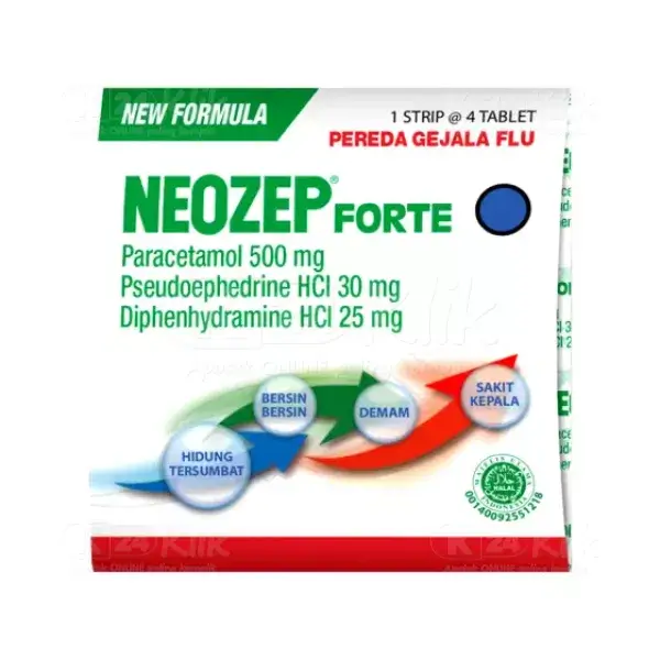 Deskripsi:Neozep Forte merupakan obat untuk meringankan gejala flu seperti demam, sakit kepala, hidung tersumbat dan bersin-bersin.