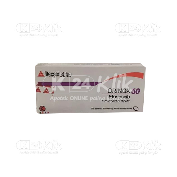 Deskripsi:Orinox adalah obat yang mengandung Etoricoxib digunakan untuk mengatasi nyeri dan pembengkakan akibat rheumatoid arthritis, gout arthritis serta ketika pasien juga mengalami peradangan, dan mengurangi gangguan inflamasi (peradangan) secara umum.