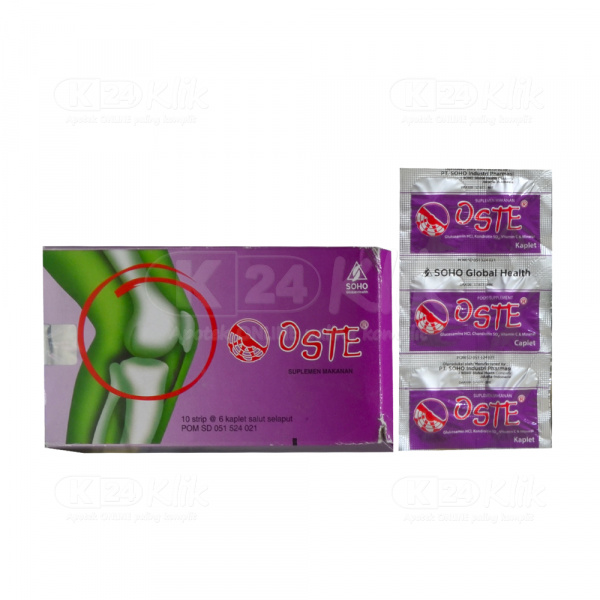 Deskripsi:Oste merupakan suplemen penunjang dalam memelihara kesehatan persendian dan untuk penderita Osteoarthritis. Oste mengandung kombinasi zat aktif Glucosamine HCl dan Chondroitin Sulfat dengan mekanisme kerja sebagai berikut: