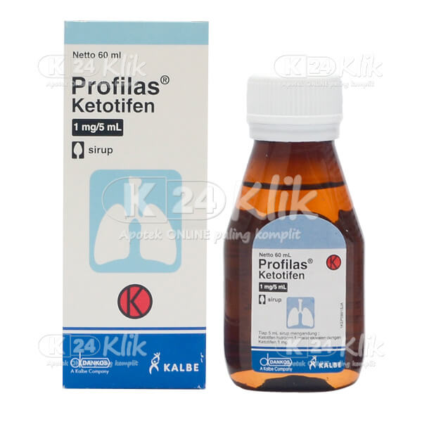 Deskripsi:Profilas merupakan obat yang digunakan untuk pencegahan jangka panjang terhadap asma bronkial dan dapat meredakan gejala rhinitis alergi. Profilas mengandung zat aktif Ketotifen yaitu antagonis histamine yang bekerja dengan menghambat mediator dari sel matosit yang banyak mengandung histamin dan heparin dimana kedua senyawa tersebut berperan dalam proses alergi terutama pada saluran pernapasan dan pembuluh darah. |
