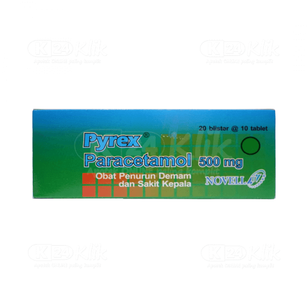 Deskripsi:Pyrex yang mengandung paracetamol diproduksi oleh PT Novell Pharma dan tersedia dalam berbagai bentuk sediaan seperti tablet. Pyrex dalam bentuk tablet ini sangat cocok untuk meredakan nyeri & demam, sakit kepala, sakit gigi pada dewasa atau anak > 12 tahun yang sudah bisa menelan tablet utuh. Penggunaan Pyrex dalam jangka yang panjang dapat menyebabkan gangguan hati. Pyrex mengurangi rasa nyeri pada arthritis ringan tapi tidak berpengaruh pada peradangan dan pembengkakan sendi |