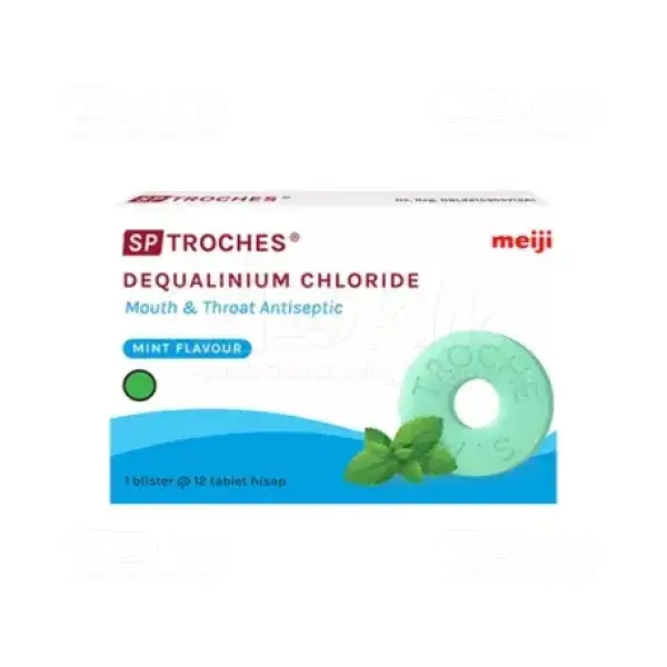 Deskripsi:SP TROCHES MEIJI MINT LOZ TABLET merupakan tablet hisap yang berfungsi untuk mengobati kondisi radang di mulut seperti sariawan, radang gusi dan di daerah tenggorokan. SP Troches mengandung zat aktif Dequalinium Chloride yang bekerja sebagai antiseptik yang mampu menghambat pertumbuhan jamur dan bakteri khususnya pada rongga mulut dan tenggorokan. SP Troches diaplikasikan dengan cara menghisap seperti permen sehingga diharapkan mampu bekerja secara langsung di daerah infeksi dan bermanfaat dalam melumasi dan menenangkan daerah yang sakit.
