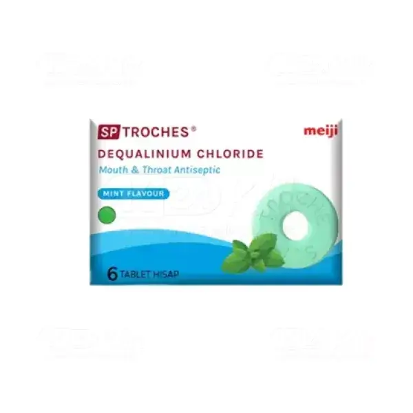 Deskripsi:SP TROCHES MEIJI MINT LOZ TABLET merupakan tablet hisap yang berfungsi untuk mengobati kondisi radang di mulut seperti sariawan, radang gusi dan di daerah tenggorokan. SP Troches mengandung zat aktif Dequalinium Chloride yang bekerja sebagai antiseptik yang mampu menghambat pertumbuhan jamur dan bakteri khususnya pada rongga mulut dan tenggorokan. SP Troches diaplikasikan dengan cara menghisap seperti permen sehingga diharapkan mampu bekerja secara langsung di daerah infeksi dan bermanfaat dalam melumasi dan menenangkan daerah yang sakit.