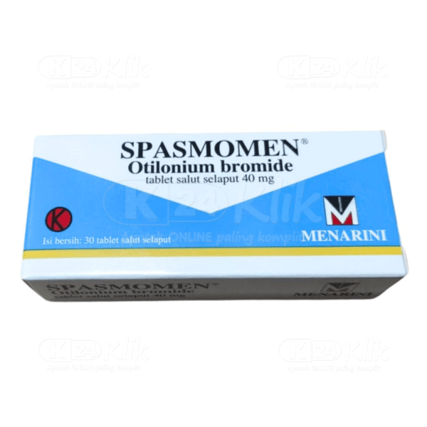 Deskripsi:Spasmomen merupakan obat yang digunakan untuk penanganan IBS (Irritable Bowel Syndrome) yaitu gangguan motilitas pada usus besar yang dapat menyebabkan diare atau sembelit. Spasmomen mengandung senyawa aktif Otilunium Bromida yaitu obat yang bereaksi sebagai spasmolitik pada otot polos saluran pencernaan. Kerja utama Otilunium Bromida yaitu kombinasi sifat antimuskarinik (mengurangi motilitas usus) dan penghambat calcium-channel. |