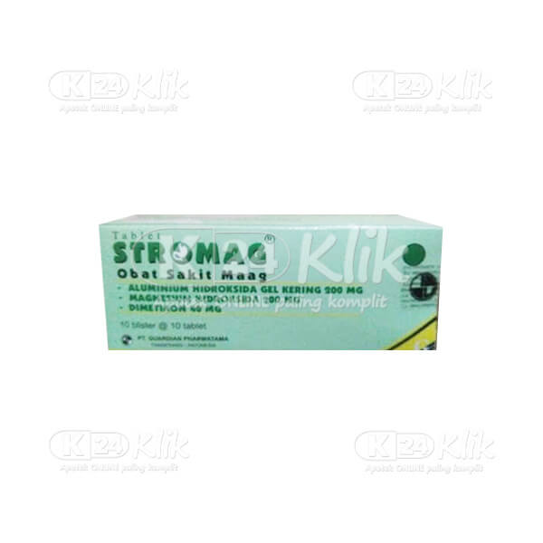 Deskripsi:Stromag merupakan obat yang digunakan untuk mengatasi penyakit-penyakit yang disebabkan oleh kelebihan produksi asam lambung, seperti sakit maag dan tukak lambung.Stromag mengandung kombinasi antasida dengan Dimetikon dengan mekanisme kerjanya yaitu : 1. Magnesium Hidroksida berperan sebagai antasida untuk mengatasi tukak lambung dengan meningkatkan pH asam lambung melalui reaksi netralisasi. Senyawa ini juga memberikan perlindungan tambahan dari asam lambung dengan melapisi mukosa lambung menggunakan endapan koloid silika. 2. Aluminium Hidroksida (Al (OH)3) adalah zat yang bekerja sebagai antasida dengan bereaksi dengan asam berlebih di dalam lambung sehingga mengurangu gejala ulkus, mulas atau dyspepsia (maag). 3. Dimetikon berfungsi dalam mengurangi kembung, ketidaknyamanan atau rasa sakit yang disebabkan oleh gas yang berlebihan dalam perut atau usus. Obat ini bekerja dengan menurunkan tegangan permukaan gelembung gas sehingga lebih mudah untuk dikeluarkan.