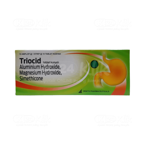 Deskripsi:Triocid merupakan obat antasida yang diproduksi oleh PT. Pharmasi Zenith dan telah terdaftar pada BPOM dengan no.registrasi DBL8527902663A2. Triocid berbentuk tablet kunyah yang mengandung Al-hidroksida 200mg, Mg-hidroksida 200mg, simetikon 20mg. Triocid dapat digunakan untuk menurunkan asam lambungyang berlebih, menghilangkan flatulent (buang angin yang terus menerus), dan menghilangkan kembung. |