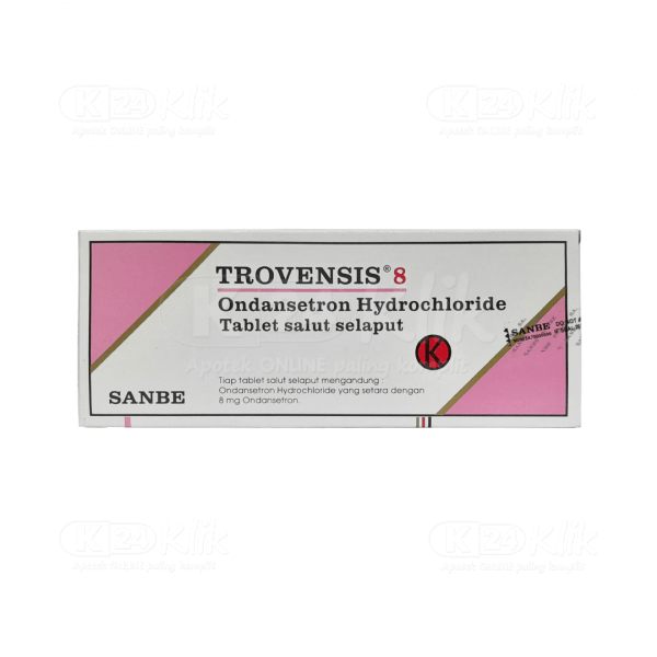 Deskripsi:Trovensis diproduksi oleh PT Sanbe Farma dalam bentuk tablet salut selaput dan telah terdaftar di BPOM. Pembuatan tablet salut selaput ini bertujuan untuk menutupi bau yang tidak enak dari bahan yang terkandung di dalam tablet Trovensis. Tiap tablet Trovensis 8 mg mengandung Ondansetron 8 mg yang dapat menangani mual dan muntah yang diinduksi oleh kemoterapi & radioterapi, serta mual dan muntah pasca operasi. |