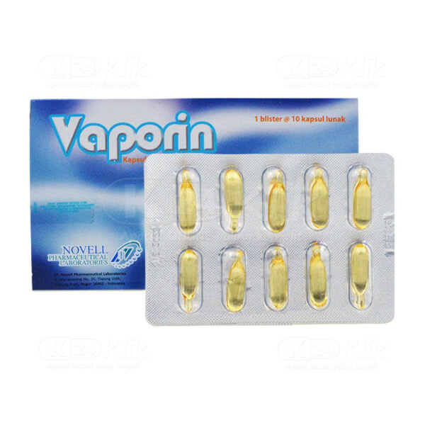 Deskripsi:Vaporin merupakan kapsul lunak berisi cairan inhalasi yang berfungsi sebagai dekongestan hidung, dengan aroma yang dapat melegakan pernafasan saat dihirup. Beli Vaporin Dekongestan di apotek online K24klik dan dapatkan manfaatnya. 1 PCS= 1 STRIP |