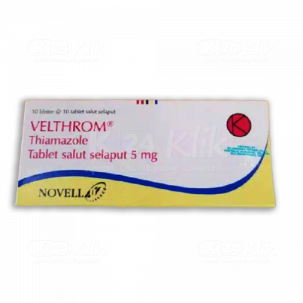 Deskripsi:VELTHROM 5MG FC TAB 100S memiliki kandungan bahan aktif Thiamazole. Thiamazole merupakan obat golongan antitiroid yang digunakan untuk mengurangi produksi hormon tiroid pada penderita hipertiroidisme. |