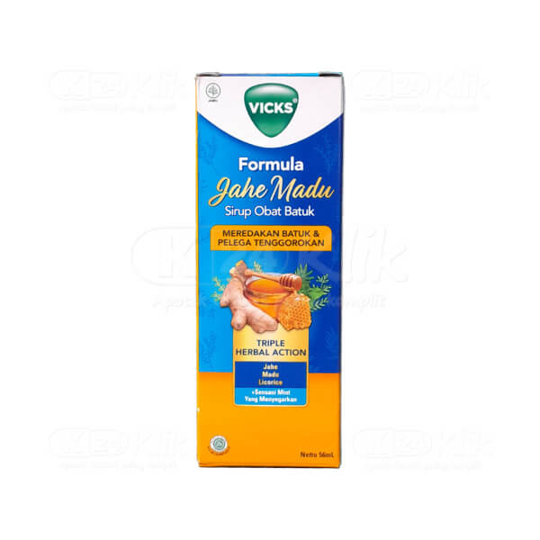 VICKS FORMULA JAHE MADU SIRUP 56ML merupakan obat herbal yang digunakan untuk meredakan batuk dan melegakan tenggorokan. Obat ini memiliki kandungan bahan alami yang sudah teruji, sehingga aman digunakan.