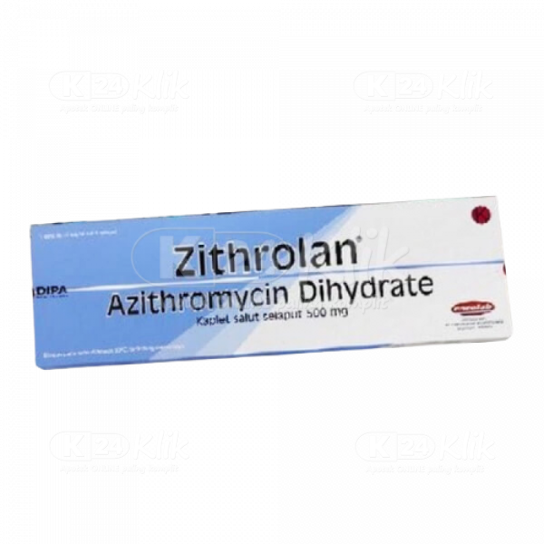 Deskripsi:ZITHROLAN 500MG FC CAPL 10S memiliki kandungan bahan aktif Azithromycin Dihydrate. Azithromycin Dihydrate merupakan antibiotik golongan makrolida yang mempunyai spektrum luas, aktif terhadap bakteri gram negatif maupun gram positif. Azithromycin bekerja dengan cara mengikat sub unit 50s dari ribosom bakteri sehingga menghambat translasi mRNA. Dengan demikian sistesis protein akan terganggu sehingga pertumbuhan bakteri akan terhambat.
